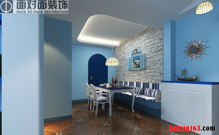 在本案例的设计当中,完美的将地中海风格的特点展现的淋漓尽致,通过对色彩的搭配,将海天一色的感觉完美的展现出来,在客厅的装饰布置当中,采用平顶式的石膏板吊顶,蓝色的实木横梁搭配上一盏形如风扇的吊灯,让空间的造型显得更加的新颖别致,沙发背景墙以淡蓝色为主,两幅壁画的悬挂无疑增添很多设计看点,落地窗的设计搭配上轻质的窗帘,在装饰空间的同时也能随意调节空间的采光效果,别致独特的地毯同样有着很大的看点,而台灯等摆放以及茶几上装饰品的摆放,无疑增添了空间的艺术氛围,反观餐厅的设计同样也展现出浪漫、温馨的一面。
