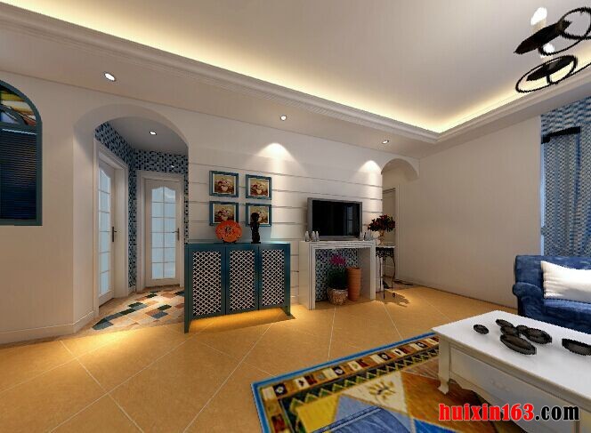 本案例采用的是地中海风格的装修风格,在整个空间的设计当中,浅色的元素装饰,让空间显得更加的惬意舒适,在客厅的装修当中,采用的是平顶式的石膏板吊顶,背景色彩以白色为主,搭配上一盏黑色的铁艺吊灯,形如蜡烛的灯光更是展现出一种野性的美感,个性的沙发背景墙,铺贴上蓝白参杂的壁纸,深蓝色的沙发布艺添加将地中海风格的形神特征展现得淋漓尽致,仿古砖的铺贴,更是营造出一种温馨的氛围,五颜六色的地毯添加,将空间的色彩点缀得更加完美,如果在客厅当中在适当的添置一些绿植,其装饰效果会更加完美,也能将空间的美提升一个档次。