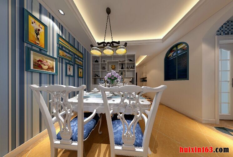 本案例采用的是地中海风格的装修风格,在整个空间的设计当中,浅色的元素装饰,让空间显得更加的惬意舒适,在客厅的装修当中,采用的是平顶式的石膏板吊顶,背景色彩以白色为主,搭配上一盏黑色的铁艺吊灯,形如蜡烛的灯光更是展现出一种野性的美感,个性的沙发背景墙,铺贴上蓝白参杂的壁纸,深蓝色的沙发布艺添加将地中海风格的形神特征展现得淋漓尽致,仿古砖的铺贴,更是营造出一种温馨的氛围,五颜六色的地毯添加,将空间的色彩点缀得更加完美,如果在客厅当中在适当的添置一些绿植,其装饰效果会更加完美,也能将空间的美提升一个档次。