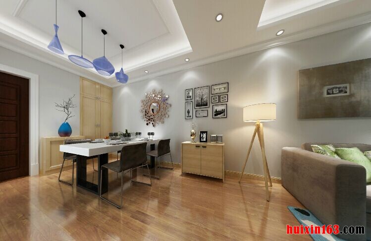在本案例的设计当中,采用的是现代简约的装修风格,但通过对造型的设计以及色彩的搭配,展现出一种新颖雅致却又亮丽突出的居室氛围,例如在客厅的装饰布置当中,采用平顶式的石膏板吊顶,搭配上一盏别致独特的吊灯,更是凝聚着空间视觉的焦点,实木铺设的地板,恰到好处的绿植装饰点缀以及绿色色彩的添加,更是营造出一种如同田园的气氛,一盏浅蓝色的地毯铺设,也将客厅点缀得比较时尚、大气,落地窗的设计搭配上轻质的窗帘,在装饰空间的同时,也能很好的调节空间的采光强度,电视柜上设计成储藏柜的形式,还增添了空间的收纳功能。