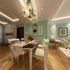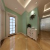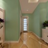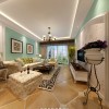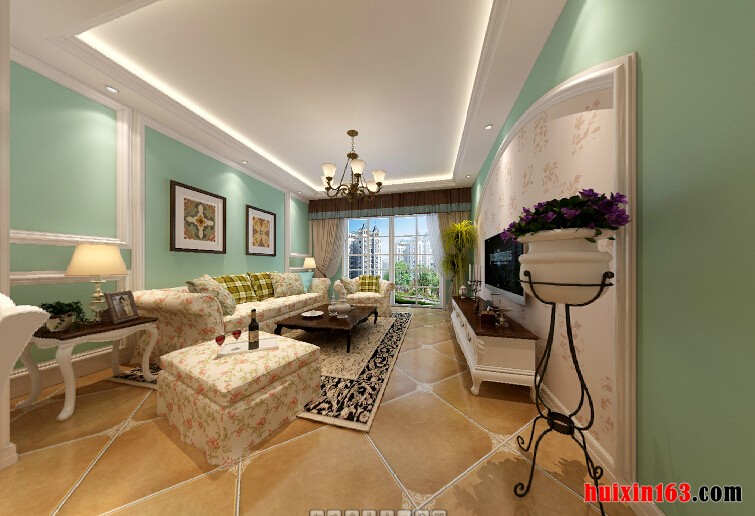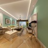 在客厅的地面上铺设的是一些仿古的黄色的瓷砖,在每个瓷砖的顶角处都有一些别致的花纹,增添了整体空间的质朴高雅的感受。在墙面上采用淡绿色和淡蓝色的墙漆,透出清新自然的田园气质。在顶面上是一圈明亮的灯带,在灯带的周边是一些明亮的射灯,整体的光线特别的有层次感。在电视背景墙上设计的白色的门套形成了一个拱门的造型,在拱门里面是一些田园风格的碎花纹的墙纸,充满了清新自然的田园气质。