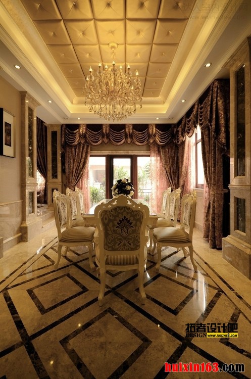 在墙面的设计上运用了非常多的欧式的元素,包括一些罗马柱和方形的浮雕柱的设计,给人非常唯美优雅的感受。在地面上铺设的地毯的花纹构造也非常的精细,线条的运用出神入化,平面的地毯能够装饰出立体的效果。高靠背的欧式欧式家居让人觉得充满了宫廷的奢华感受。
