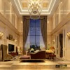 客厅的设计非常的豪华大气,两层房间的高度让人置身其中感受到无限的奢华和高贵。考亭的窗子的设计也非常的大气,将两层高的空间完全占满,空间的整体效果非常的统一大气。在客厅的顶面上采用轻钢龙骨加石膏板制作的吊顶结构层次感非常的好,不仅在平面上呈现出一些精致的分区,在立体上看来也非常的雅致。在客厅顶面中央的位置悬挂一盏超豪华的水晶灯,与房间的气质特别的相称。