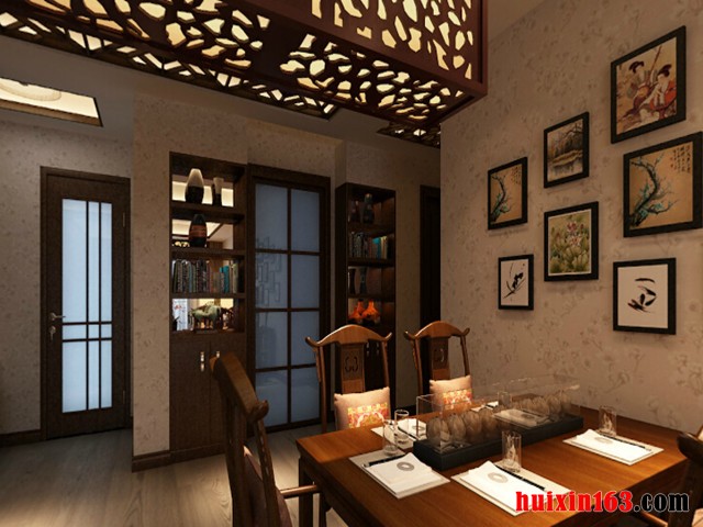 餐厅的位置就在客厅的旁边,餐厅的装饰比较明亮和具有现代时尚感气息的,实木的整体家具的搭配和实木框架的吊灯起到相互衬托的作用,墙面上一排照片墙的存在更是为餐厅的气氛营造出更多的温馨和浪漫感。
