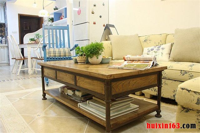 在客厅里面的家居的布置看起来非常的随意,但是却让人感觉非常的舒服,实木的桌子搭配铁制的架子,表现出自然和工业相融合的冲突和矛盾,一百蓝色的实木摇椅搭配浅灰色的碎花图案的沙发,给人一种非常幽静淡雅的感受。在沙发背景墙上面铺贴了一张绿草地踏青的图画,表现了房间的主人对自然和田野的向往,让空间无形中和大自然联系起来。